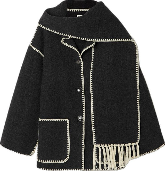 Manteau en Laine Femme Épais et Ample avec Écharpe - Veste Élégante d'Hiver Draped fringed wool-blend jacket